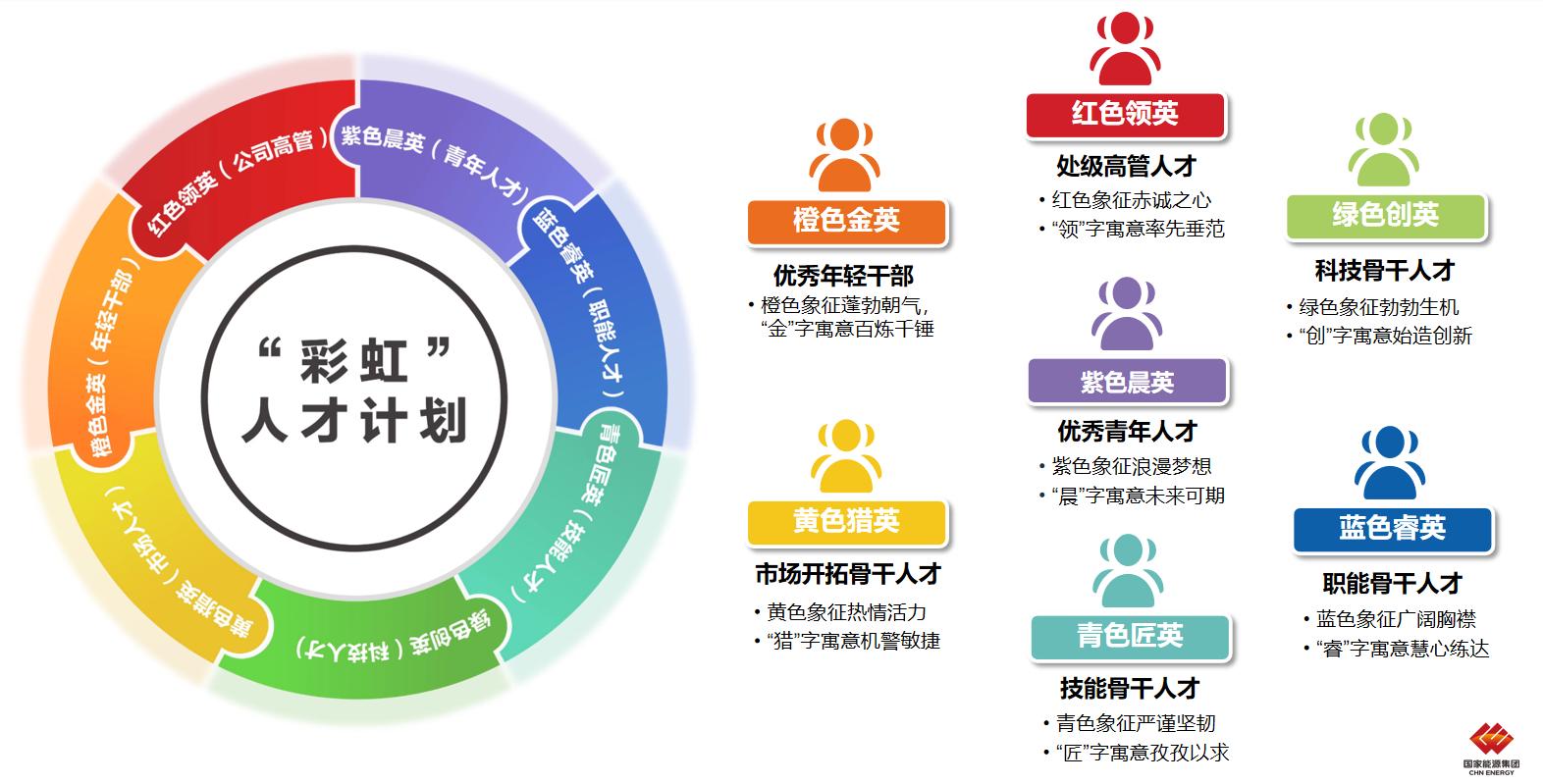 “彩虹人才”計劃以彩虹顏色與崗位特征釋義七類核心骨干:紅色領(lǐng)英、橙色金英、黃色獵英、綠色創(chuàng)英、青色匠英、藍色睿英、紫色晨英。通過制定各顏色人才專項培養(yǎng)計劃、建立“一心五品七力”勝任力模型、設(shè)計人才IDP、彩虹人才專項培訓(xùn)、考核人才培養(yǎng)“四率”,促進員工內(nèi)在成才需求與企業(yè)高質(zhì)量發(fā)展總目標(biāo)有機融合。